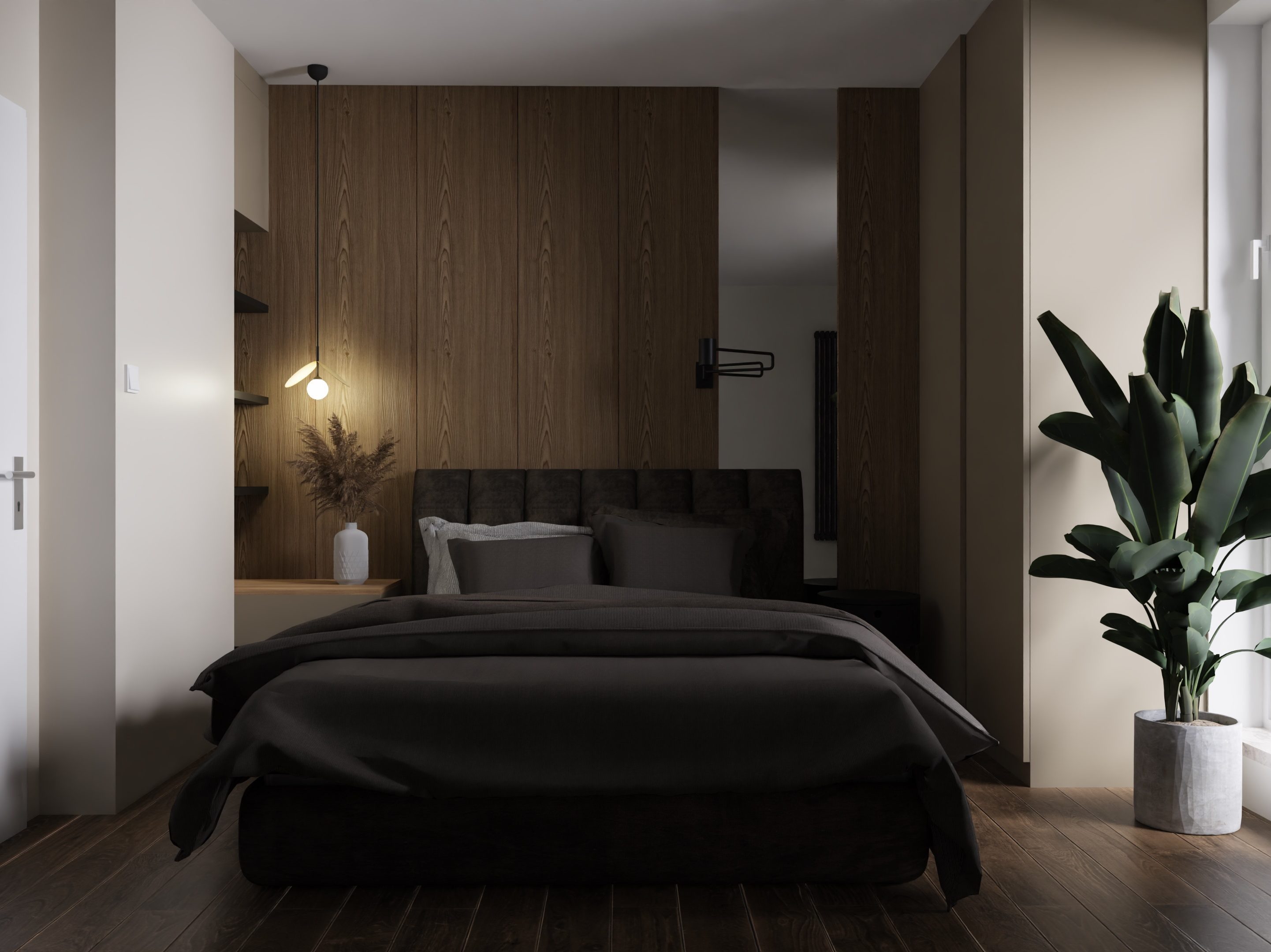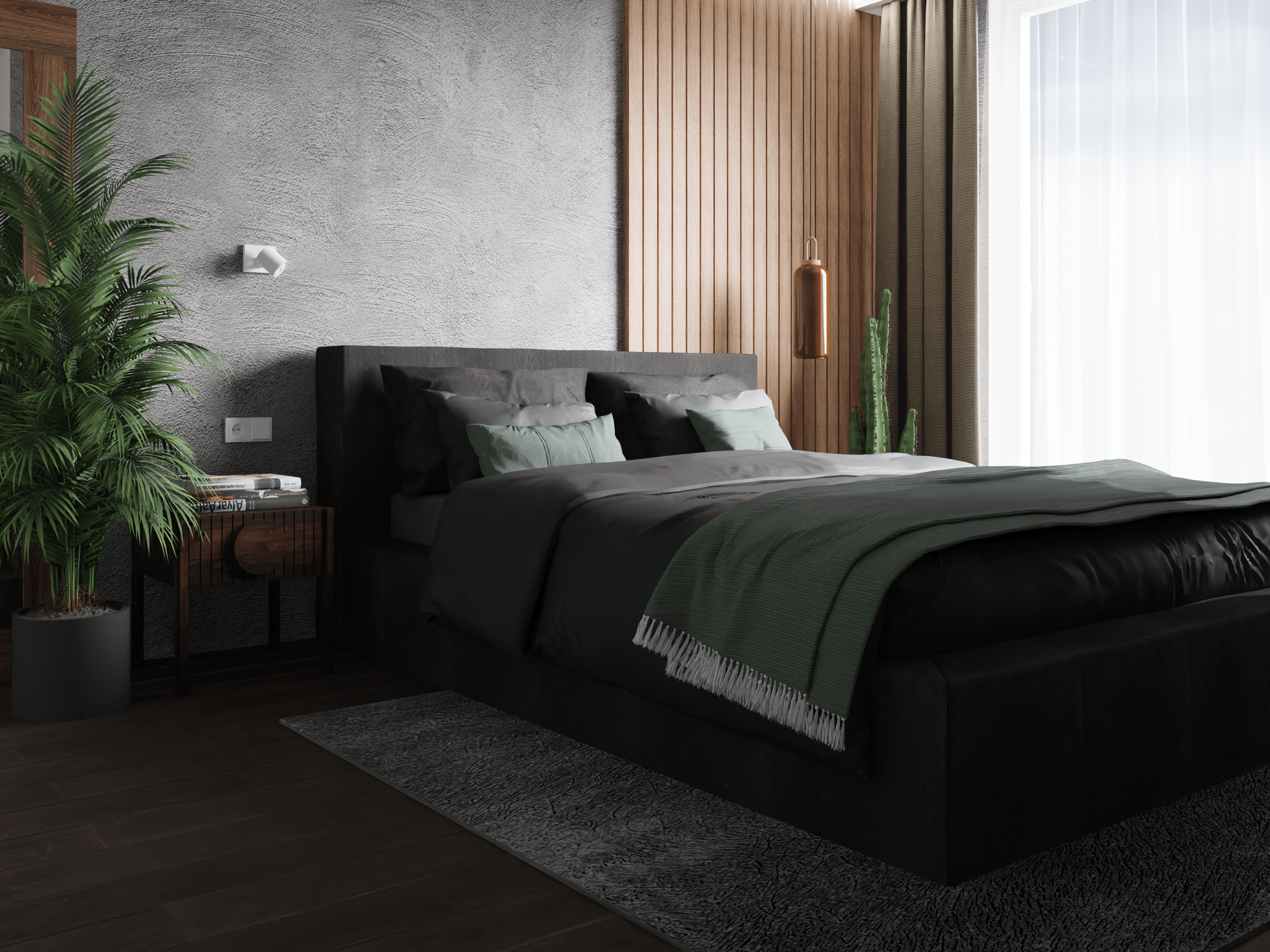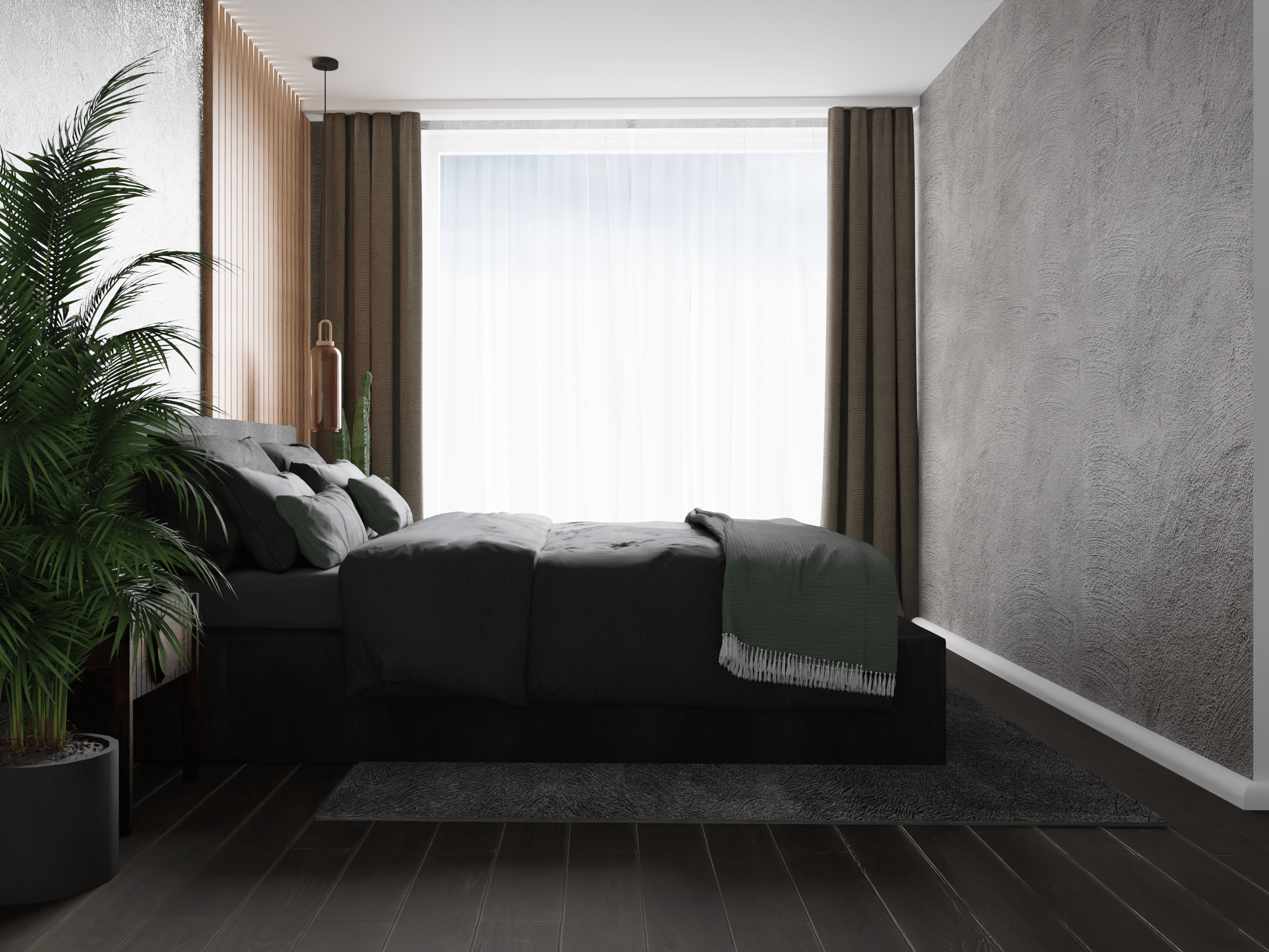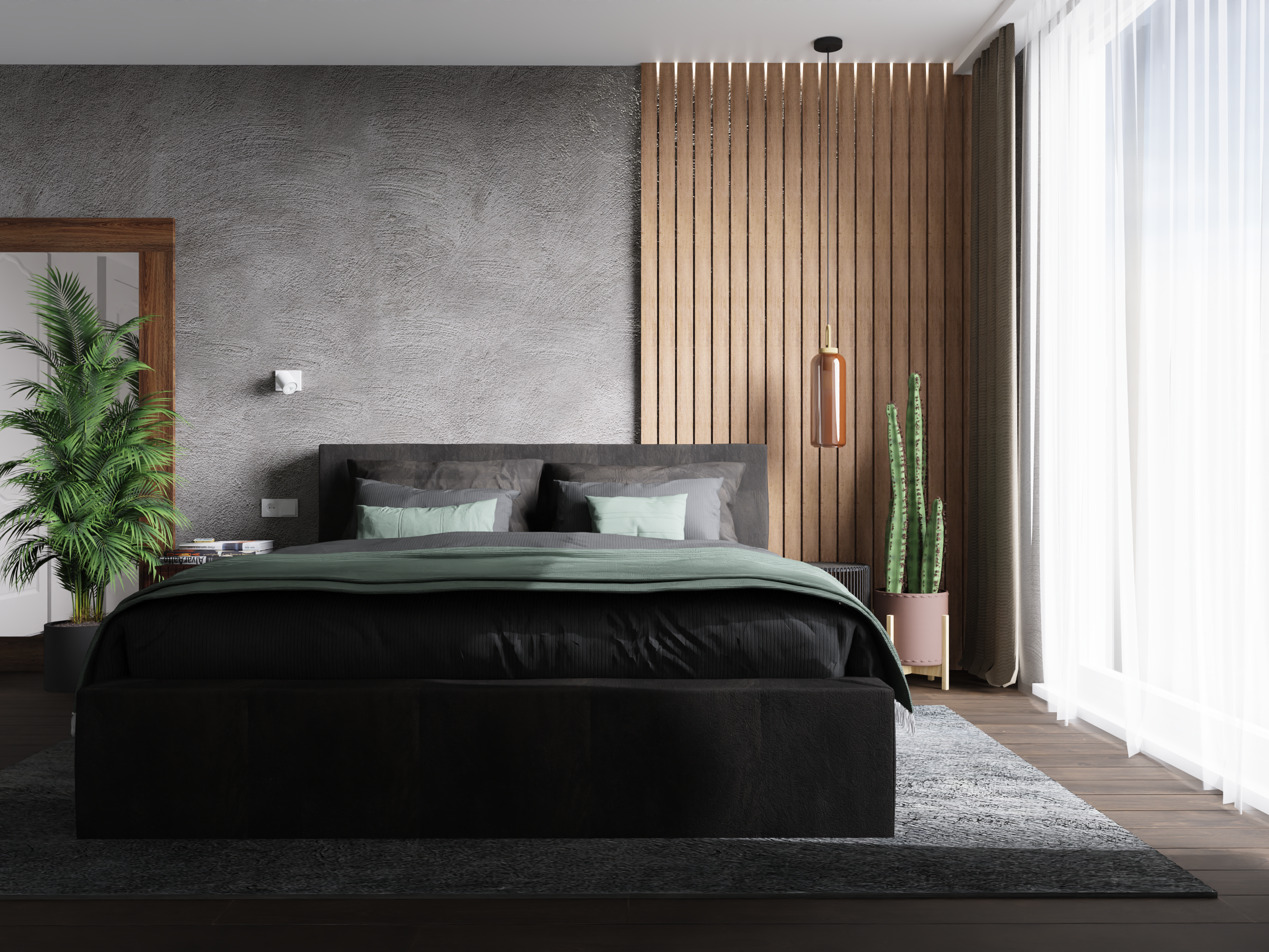 Projekt wnętrza w stylu soft LOFT. Duże okno od strony południowej pozwala na użycie w projekcie ciemniejszych kolorów we wnętrzu. Dzięki temu sypialnia jest elegancka, a światło słoneczne pięknie podkreśla zamontowane lamele na ścianie, które natomiast dają percepcję ciepła oraz faktury betonu na ścianie.