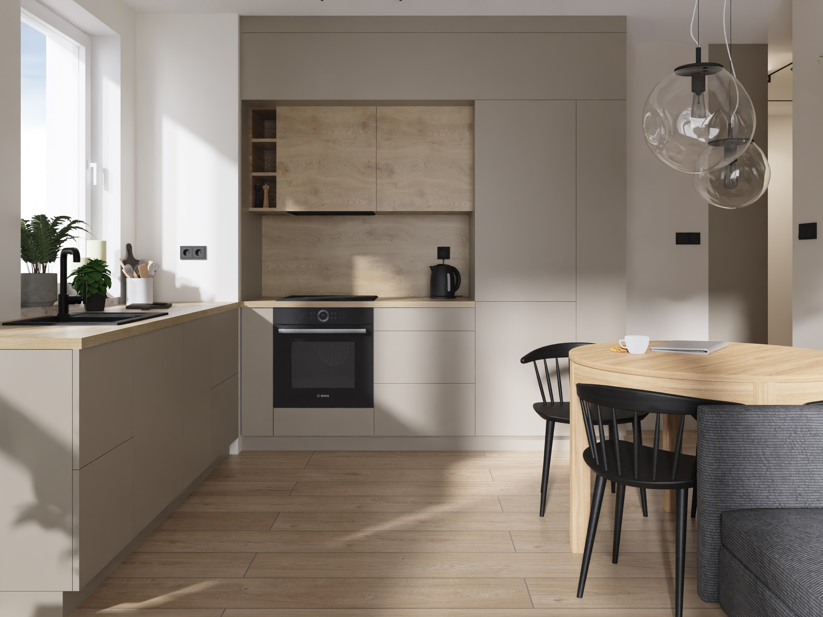 Projekt wnętrza, zaprojektowany w stylu nowoczesnym w kolorach ziemi. Niewymuszona, lekka i przytulna przestrzeń mieszkalna. Małe mieszkanie, w którym bardzo dobrze zaprojektowana jest komunikacja, dużo szaf do przechowywania, dzięki temu każda rzecz ma swoje miejsce.